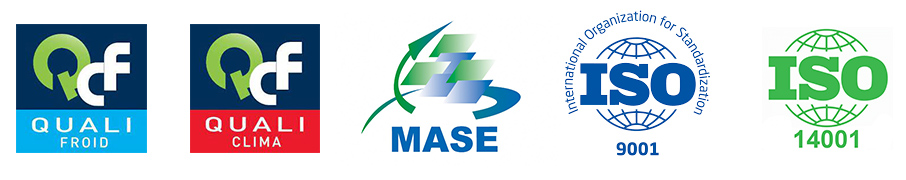 Afin de répondre aux exigences des environnements industriels et tertiaires et garantir la sécurité des personnes et des biens, nos entreprises sont certifiées : Quali Froid, Quali Clima, Mase, ISO 9001, ISO 14001.